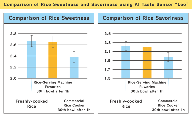 AI Taste Sensor "Leo" rated the freshly-cooked rice’s sweetness and savoriness as higher than the average, which was 2.5 and 2.1 respectively.